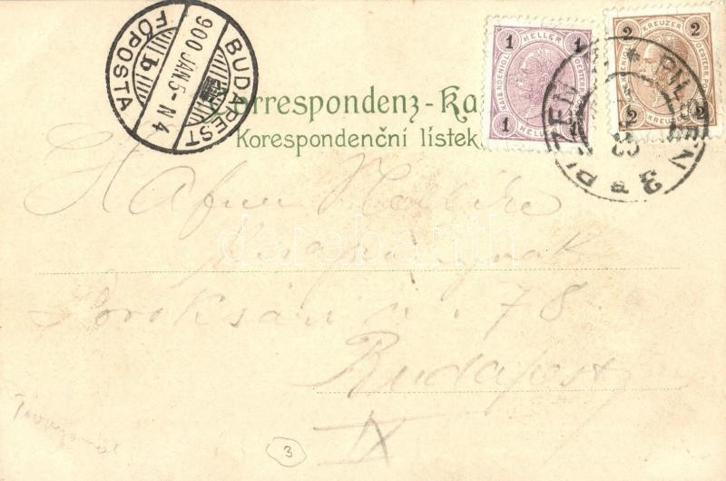 Leírás: 1900 Plzen, Pilsen; Pilsner Urquell Bürgerl. Brauhaus / brewery, coat of arms. Postkartenverlag Hug Fomann Art Nouveau, floral, litho