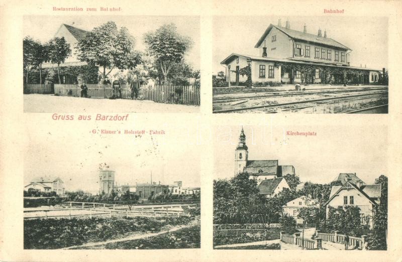 Leírás: Bernartice, Barzdorf; Restauration zum Bahnhof, Bahnhof, G. Elsner's Holzstoff-Fabrik, Kirchenplatz / restaurant, railway station, church square, wood pulp factory, sawmill