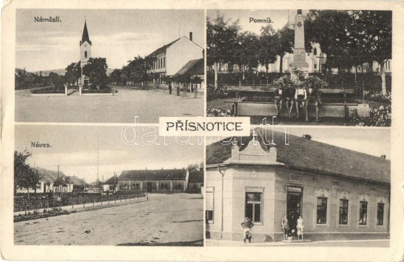Leírás: Prísnotice, Námesti, Pomník, Náves / main square, church, WWI Heroes monument, street view, shop. Foto Suchy (EK)