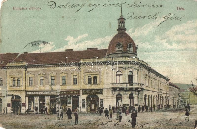 1906 Dés, Dej; Hungaria szálloda, kávéház és étterem, Kanyó Antal, Reh... https://www.darabanth.com/hu/342-Gyorsarveres/342.0/Kepeslapok/Erdely~2000005/1906-Des-Dej-Hungaria-szalloda-kavehaz-es-etterem-Kanyo-Antal-Rehak-Agoston-Bako-Mi~II1930154