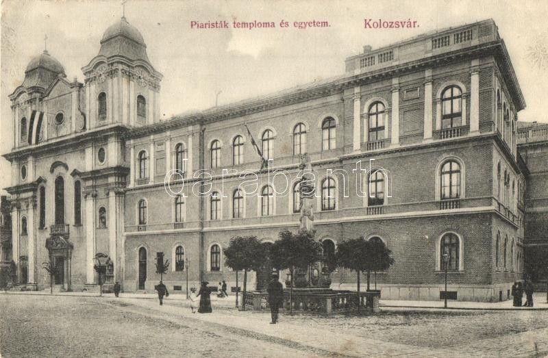 Leírás: 1908 Kolozsvár, Cluj; Piaristák temploma, egyetem. Kiadja Schuster Emil / Piarist church, university (EK)