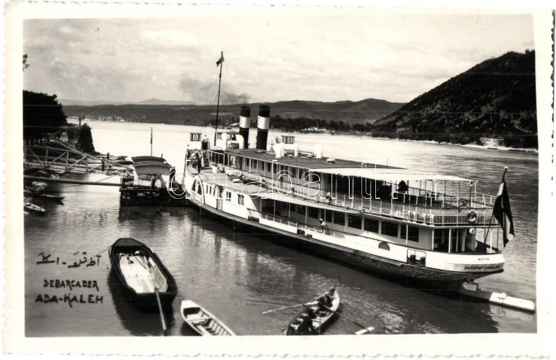 Leírás: Ada Kaleh, Debarcader / rakpart, kikötő az MFTR "Erzsébet királyné" kerekes gőzösével / wharf, port, Hungarian passenger steamship. Ömer Feyzi Boray photo