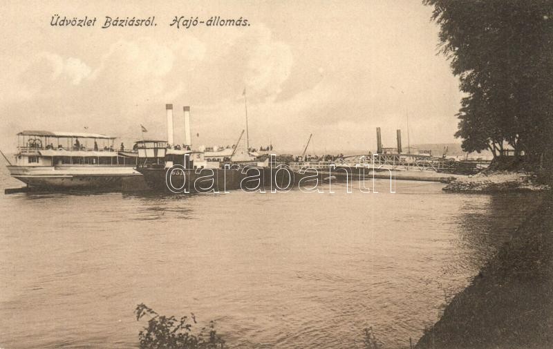 Leírás: Báziás, hajóállomás, gőzhajó és uszály / port, steamship and barge