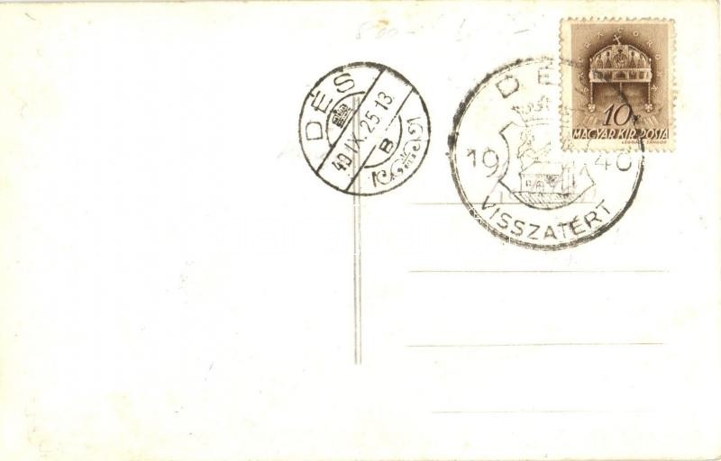 Leírás: Dés, Dej; Református templom, kerékpáros / Calvinist church, man on bicycle + 1940 Dés visszatért So. Stpl. (EK)