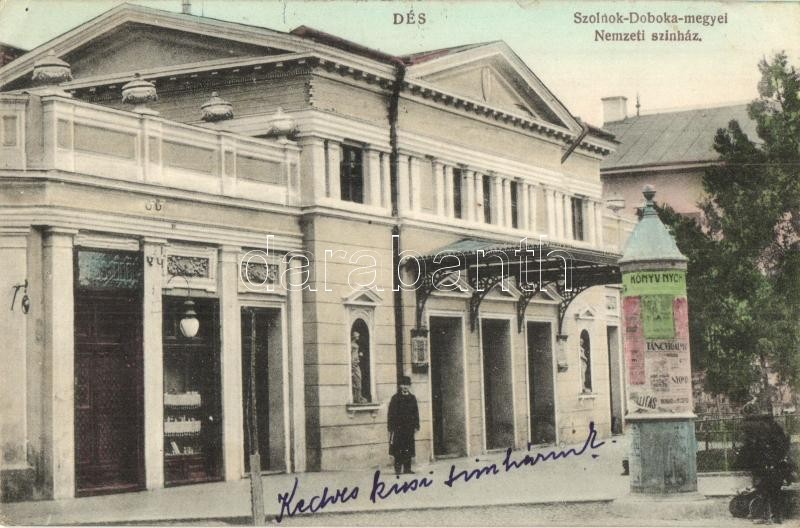 Dés, Dej; Szolnok-Doboka megyei Nemzeti színház, hirdetőoszlop. Kiadja Goldstein Jakab / Comitatul Solnoc-Dabaca National Theater, advertising column (EK)