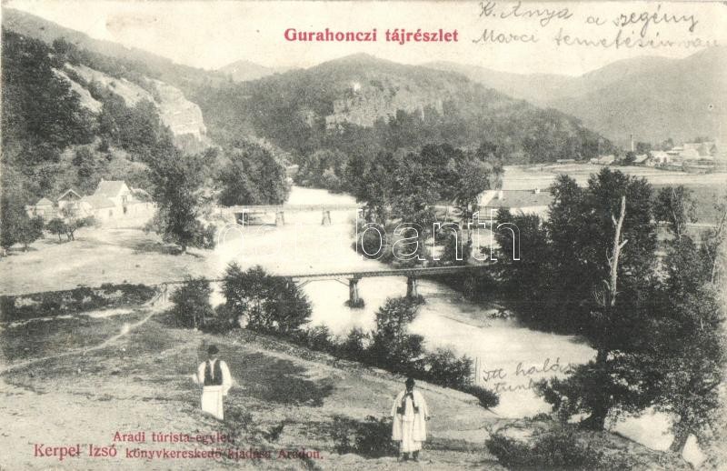 Leírás: Gurahonc, Honctő, Gurahont; látkép, híd, Aradi turista egylet, Kerpel Izsó kiadása / general view, bridge, tourist association (EK)