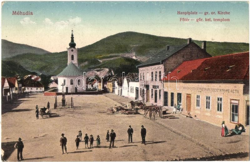Mehádia, Mehadia; Hauptplatz, gr. or. Kirche / Fő tér, Görögkeleti ortodox templom, Takarékpénztár, üzletek. Kiadja Brauch A. fia 7909b. / main square, Orthodox church, savings bank, shops (EK)