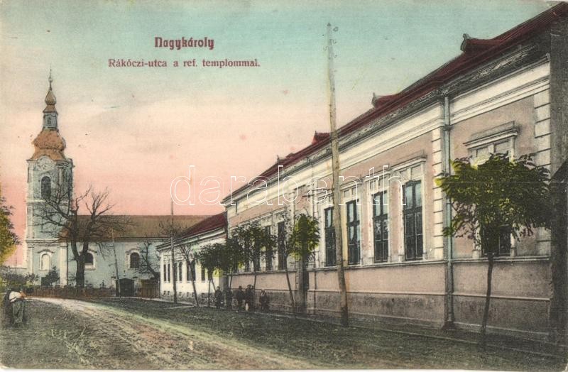 Nagykároly, Carei; Rákóczi utca, református templom. Sámuel Sándor kia... https://www.darabanth.com/hu/342-Gyorsarveres/342.0/Kepeslapok/Erdely~2000005/Nagykaroly-Carei-Rakoczi-utca-reformatus-templom-Samuel-Sandor-kiadasa-street-view-with~II1810542