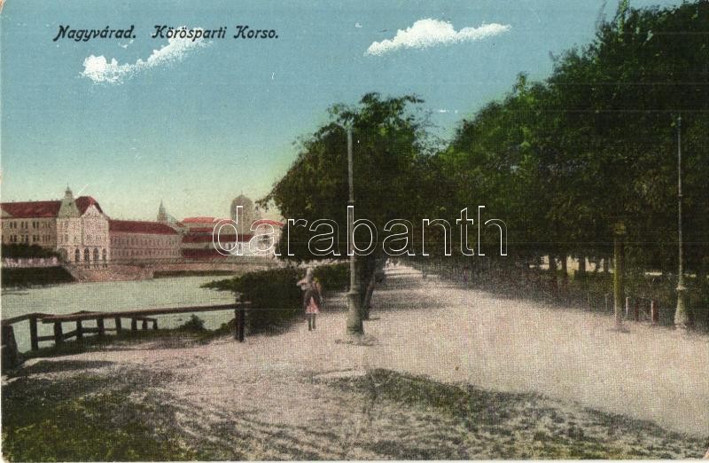 Leírás: Nagyvárad, Oradea; Körös parti korzó, sétány, hátul a zsinagóga / Cris riverside promenade, synagogue in the background