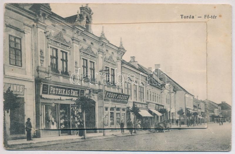 Torda, Turda; Fő tér, Petrikás Emil, Pál Lajos és Füssy József üzlete, gyógyszertár, drogéria. leporellolap, kiadja Füssy József / main square with shops, pharmacy. leporellocard (fl)