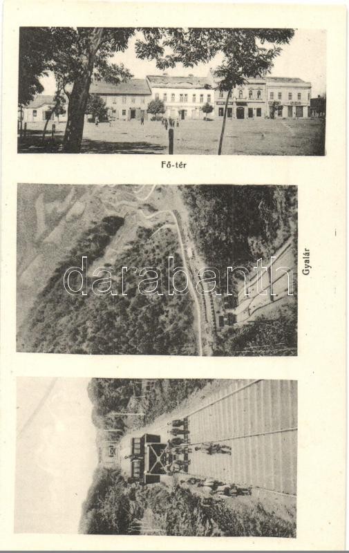 Leírás: Vajdahunyad, Hunedoara; Fő tér, Klein Adolf üzlete, Gyalári hegyi sikló, iparvasút / main square, shops, industrial railway in Ghelari