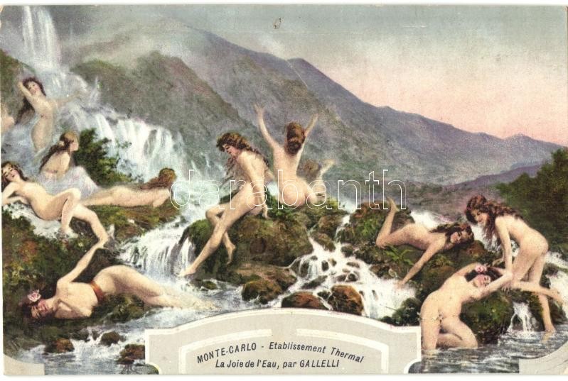 Leírás: Monte-Carlo Etablissement Thermal La Joie del'Eau / Erotic nude lady advertising art postcard s: Galleli (fl)