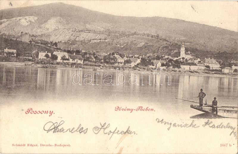 1900 Dévény, Theben a. d. Donau, Devín (Pozsony, Bratislava); látkép a várral. Kiadja Schmidt Edgar / Devínsky hrad / general view with castle ruins (EK)