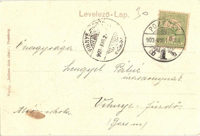 Leírás: 1903 Pozsony, Pressburg, Bratislava; Városi színház, villamos Stollwerck csokoládé reklámmal. "Bediene dich allein" / theater, tram with Stollwerck chocolate advertisement (EK)