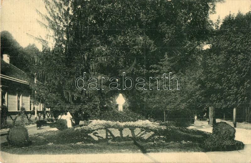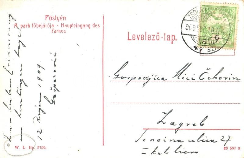 1909 Pöstyén, Pistyan, Piestany; A park főbejárója, Erzsébet királyné szobor. W. L. Bp. 5750. / Haupteingang des Parkes / park entrance, Empress Elisabeth of Austria (Sisi) statue (EK)