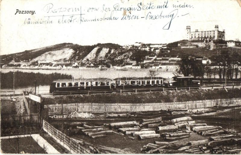 Leírás: 1913 Pozsony, Pressburg, Bratislava; látkép, fűrésztelep, fatelep, vár, Pozsony-Bécs villamos vasút / general view, sawmill, castle, Bratislava-Wien urban railway, tram (EK)