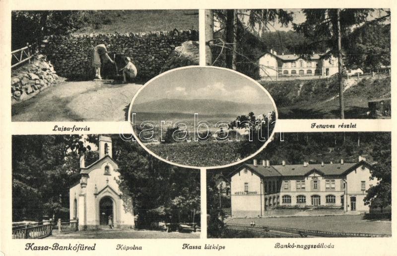 Leírás: Bankó-fürdő, Bankov (Kassa, Kosice); Lujza forrás, Fenyves, Bankói nagyszálloda, Kápolna / spring, forest, hotel, chapel