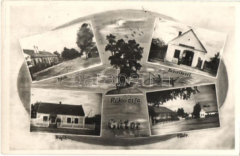 Leírás: Gutor, Hamuliakovo; Iskola, Fogyasztási Szövetkezet üzlete, Trafik, Fő tér, Rákóczi ősfa / street view, school, cooperative shop, tobacco store, main square. Foto Trokán