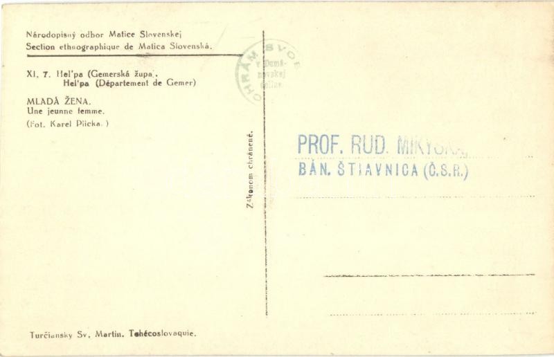 Helpa, Heľpa (Gömör, Gemer); Národopisny odbor Matice Slovenskej. Mladá zena / A Szlovák Matica néprajzi gyűjtéséből. Helpai lány népviseletben, folklór / From the Ethnographic department of Matica slovenská. Girl from Helpa in traditional costumes, folklore. Fot. Karel (Karol) Plicka