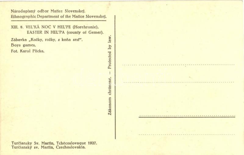 Helpa, Heľpa (Gömör, Gemer); Národopisny odbor Matice Slovenskej. Velká Noc v Helpe (Horehronie) / A Szlovák Matica néprajzi gyűjtéséből. Húsvét Helpában, fiúk játéka népviseletben, folklór / From the Ethnographic department of Matica slovenská. Easter in Helpa, boys play in traditional costumes, folklore. Fot. Karel (Karol) Plicka