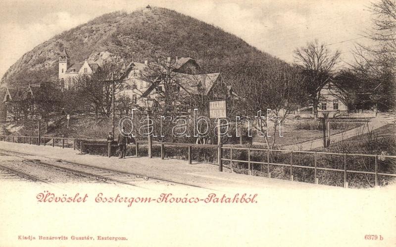 Kovácspatak, Kovacov (Esztergom); vasúti gyalogátkelőhely, "Eladó villatelkek" tábla. Kiadja Buzárovits Gusztáv / pedestrian crossing at the railway, villa site