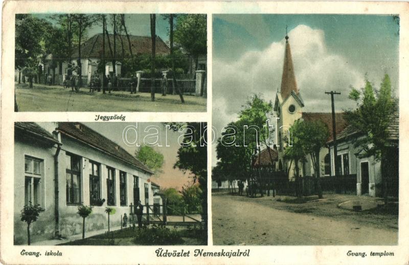 Leírás: Nemeskajal, Kajal; Jegyzőség, Evangélikus templom és iskola. Kiadja a Fogyasztási Szövetkezet / notary's office, Lutheran church and school (EB)