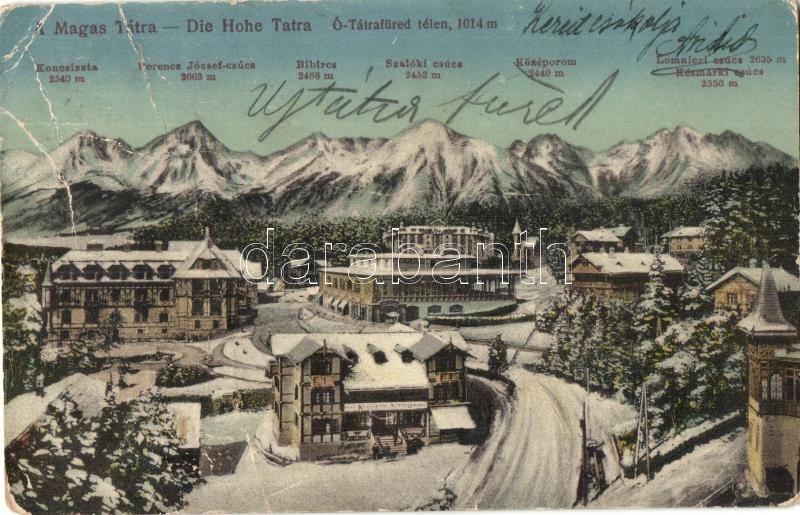 Ótátrafüred, Altschmecks, Stary Smokovec (Tátra, Magas Tátra, Vysoké Tatry); Ótátrafüred télen, nyaralók, hegycsúcsok, kávéház, Kertész Tódor üzlete / Stary Smokovec in winter, villas, mountain peaks, café, shop (fa)