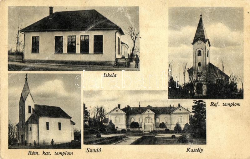Szodó, Svodov (Zseliz, Zeliezovce); Iskola, Református templom, Római katolikus templom, kastély / school, Calvinist church, Catholic church, castle (EB)