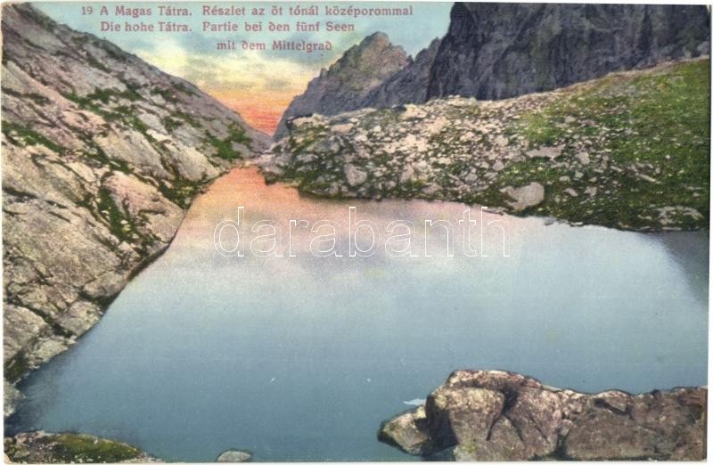 Tátra, Magas Tátra, Vysoké Tatry; Részlet az Öt tónál a Középorommal / Die hohe Tatra, Partie bei den fünt Seen mit dem Mittelgrad / Prostredny hrot / mountain peak, lake