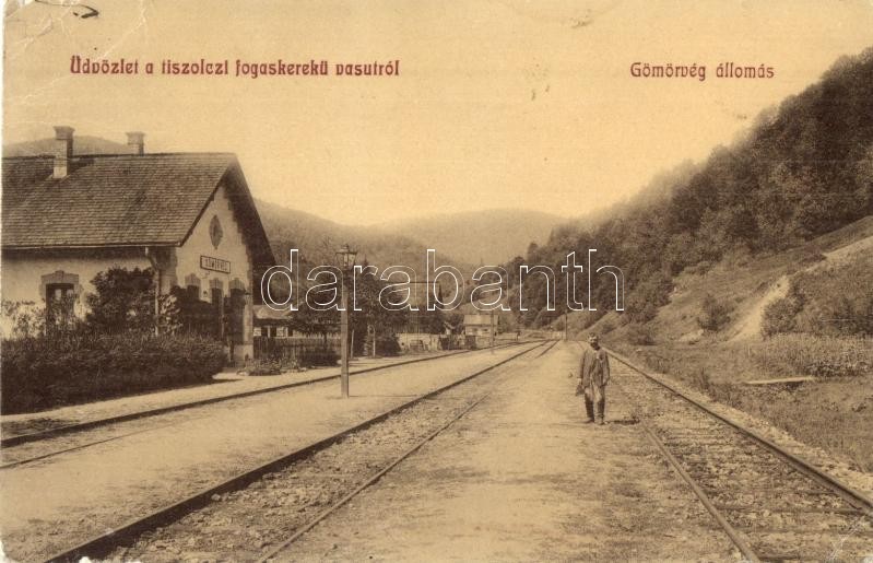 Tiszolc, Tisovec; Gömörvég vasútállomás, tiszolci fogaskerekű vasút vonala. W. L. (?) 154. Kiadja Kreisler József / Bahnhof / Tisovec-Bánovo railway station, cogwheel railway (EB)