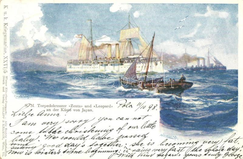 1898 SM Torpedokreuzer Zenta und Leopard an der Küste von Japan / Osztrák-Magyar Haditengerészet SMS Zenta védett cirkálója és az SMS Leopard torpedócirkáló Japán partjainál / Austro-Hungarian Navy SMS Zenta protected cruiser and SMS Peopard torpedo cruiser by the coasts of Japan. K.u.K. Kriegsmarine XXVI/5. Wiener Künstler-Postkarte. Druck und Verlag Philipp & Kramer. s: Kircher (EK)