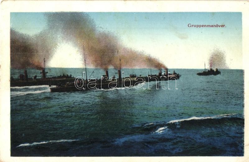 1916 Gruppenmanöver. K.u.K. Kriegsmarine / Osztrák-Magyar Haditengerészet hajói manőver közben / WWI Austro-Hungarian Navy Fleet during maneuver. G. C. Pola 1912/13. + K.u.K. Festungsartillerieregiment Freiherr von Rouvroy No. 5. Beleuchtungsanlage No. 2. (EK)