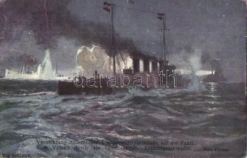 1917 Vernichtung italienischer Truppentransportschiffe auf der Fahrt nach Valona durch ein österr.-ungar. Kreuzergeschwader. K.u.K. Kriegsmarine / Osztrák-Magyar Haditengerészet cirkálóraja olasz seregszállító hajókat semmísít meg a Valonába vezető úton / WWI Destruction of Italian troop transport ships on the way to Valona (Vlora) by an Austro-Hungarian cruiser squadron s: Alex Kircher (EK)