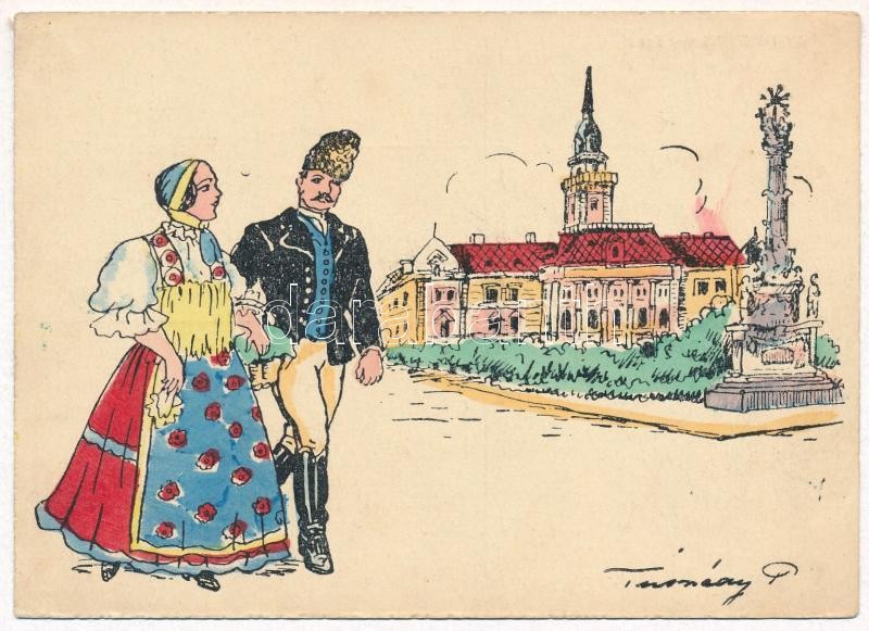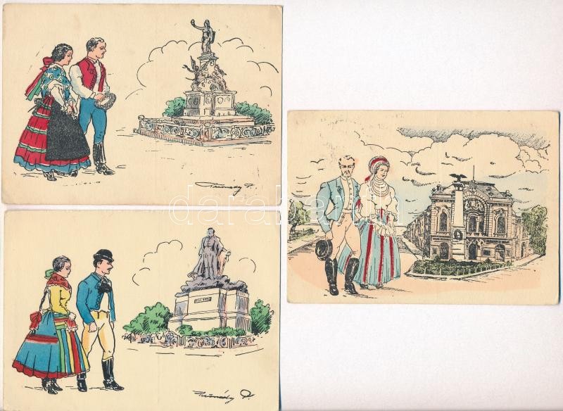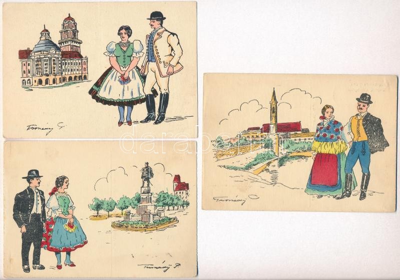 7 db RÉGI irredenta képeslap elcsatolt területek városaival és népviseletével: Szabadka, Arad, Zombor, Zenta, Újvidék, Csáktornya, Nagybecskerek. kiadja a Délvidéki Egytemi és Főiskolai Hallgatók Egyesülete, Tusnády szignó / 7 pre-1945 irredenta town-view postcards from disannexed towns with folklore: Subotica, Arad, Sombor, Novi Sad, Senta, Cakovec and Zrenjanin