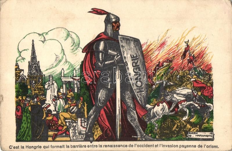 Leírás: Magyarország volt a gát a nyugati renaissance s a pogány invázió közt / Hungarian irredenta art postcard s: Eugen Haranghy (EK)