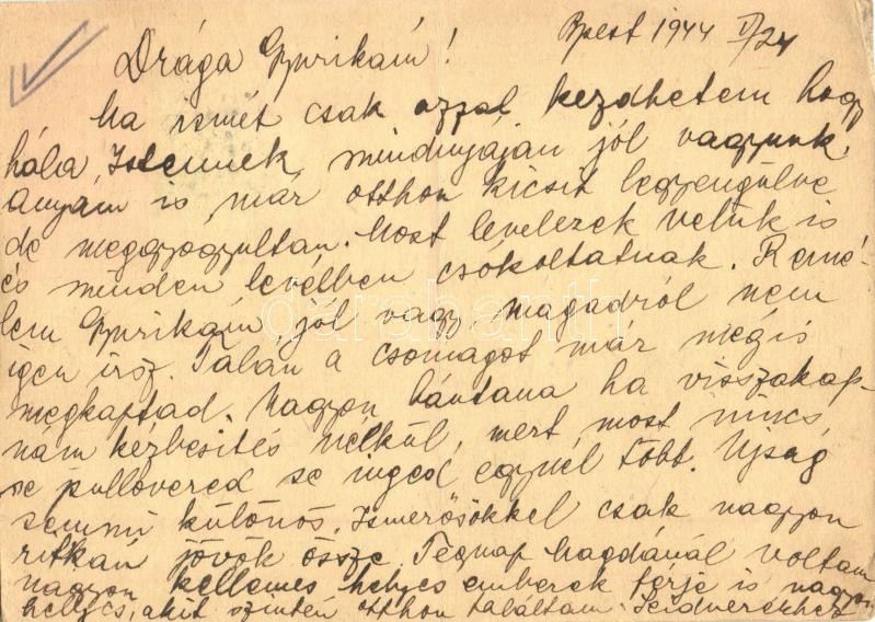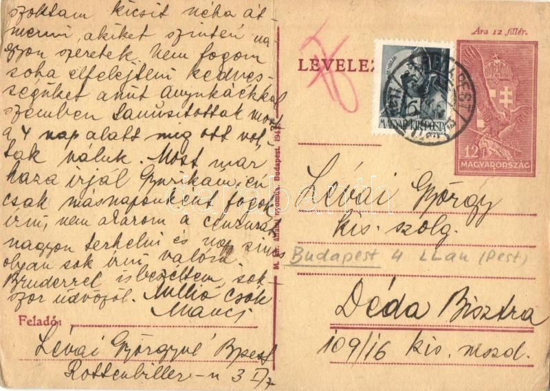 1944 Lévai Györgyné levele férjének Lévai György zsidó 109/16 KMSZ (közérdekű munkaszolgálatos) a dédabisztrai munkatáborba / WWII Letter to a Jewish labor serviceman from his wife to the labor camp of Bistra Muresului. Judaica (fa)