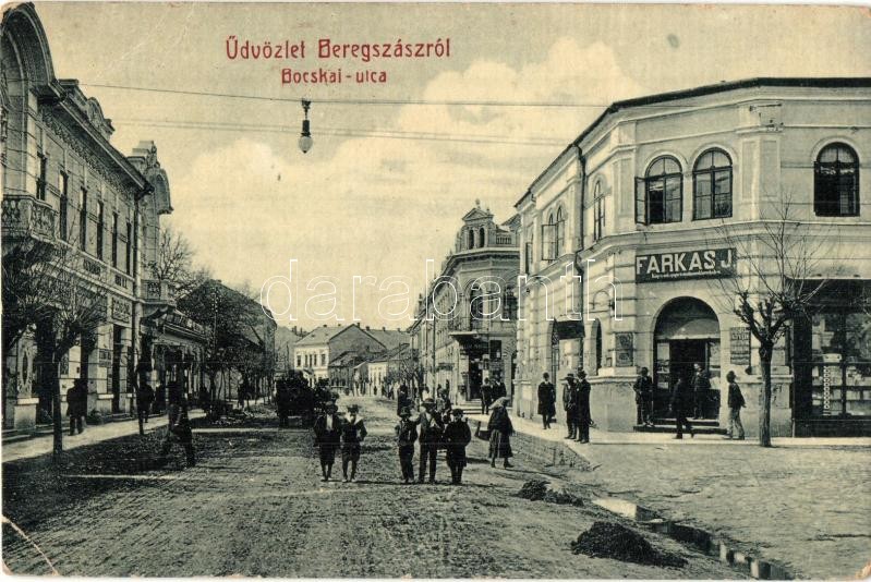 Beregszász, Berehove; Bocskai utca, Farkas J., Fuchs Emil üzlete. W. L... https://www.darabanth.com/hu/342-Gyorsarveres/342.0/Kepeslapok/Karpatalja~2000007/Beregszasz-Berehove-Bocskai-utca-Farkas-J-Fuchs-Emil-uzlete-W-L-Bp-6054-street-view-s~II1929580