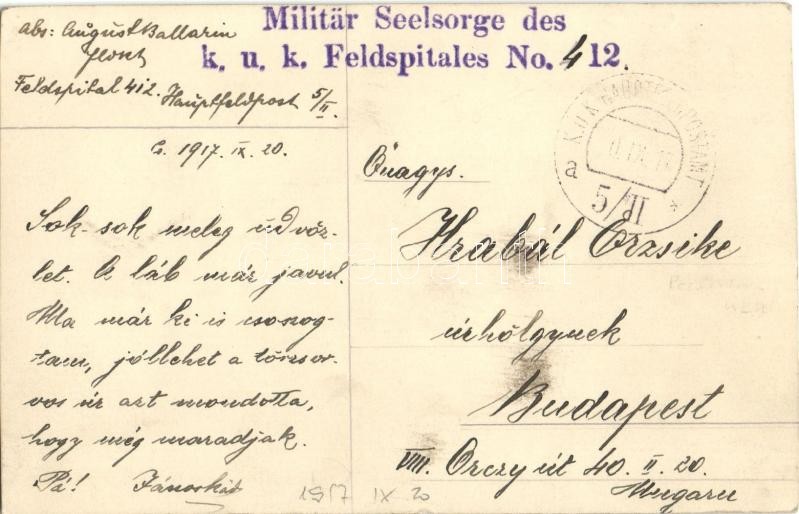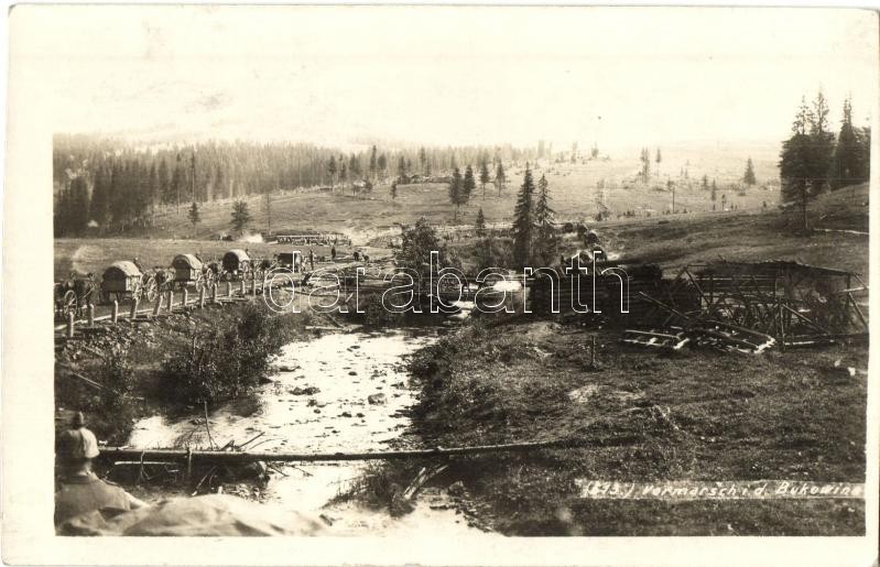 1917 Vormarsch i. d. Bukowina / Bukovinai előrenyomulás során a trén előtt a hidászok készítik a hídprovizóriumokat. Tábori posta képeslap / WWI K.u.k. military, pontooners building a bridge in fron of the train, photo + "Militär Seelsorge des k.u.k. Feldspitales No.412"