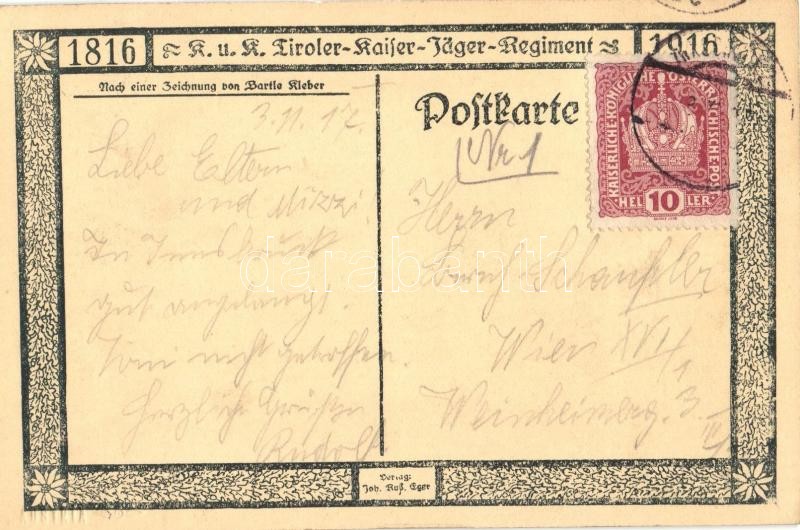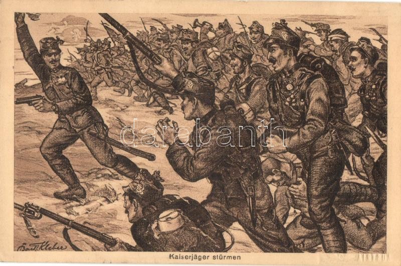 Leírás: Kaiserjäger stürmen. K.u.K. Tiroler-Kaiser-Jäger Regiment 1816-1916 / WWI Austro-Hungarian K.u.K. military art postcard s: Bartle Kleber