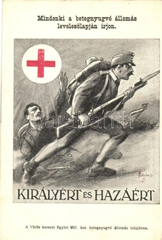 Leírás: Királyért és hazáért; Vörös kereszt Egylet dunaparti betegnyugvó állomásának tulajdona / WWI Hungarian Red Cross propaganda s: Földes