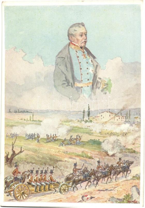 Österreichische Artillerie bei Custozza unter Vater Radetzky 1848. Chwala's Druck, Wien VII / Austrian military artillery in the Battle of Custoza, commanded by Field Marshal Radetzky s: F. N. Nemée