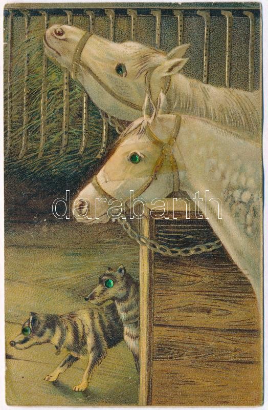 Horses with dogs. Decorated eyes. Emb. litho (Rb) https://www.darabanth.com/hu/342-Gyorsarveres/342.0/Kepeslapok/Lo~2000057/Horses-with-dogs-Decorated-eyes-Emb-litho-Rb~II1931530