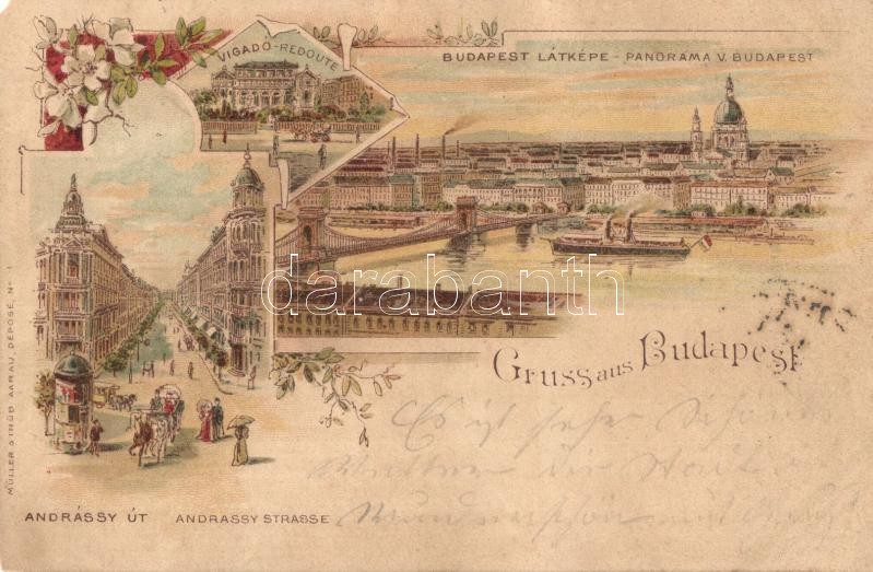 Leírás: 1897 (Vorläufer) Budapest, látkép, Lánchíd, Bazilika, Vigadó, Andrássy út, lóvasút, gőzhajó. Müller & Trüb No. 1. Art Nouveau, floral, litho (EM)