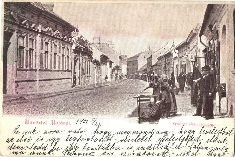 1901 Baja, Erzsébet királyné utca, üzletek (r) https://www.darabanth.com/hu/342-Gyorsarveres/342.0/Kepeslapok/Magyarorszag~2000004/1901-Baja-Erzsebet-kiralyne-utca-uzletek-r~II1929052