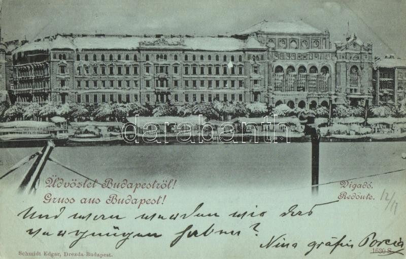 Leírás: 1901 Budapest V. Vigadó télen, havas uszályok. Kiadja Schmidt Edgar 1630 S. (ragasztónyom / glue mark)