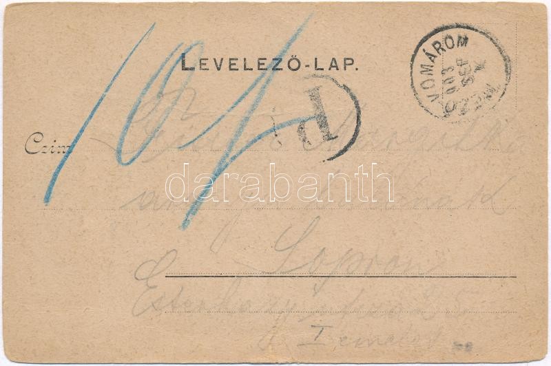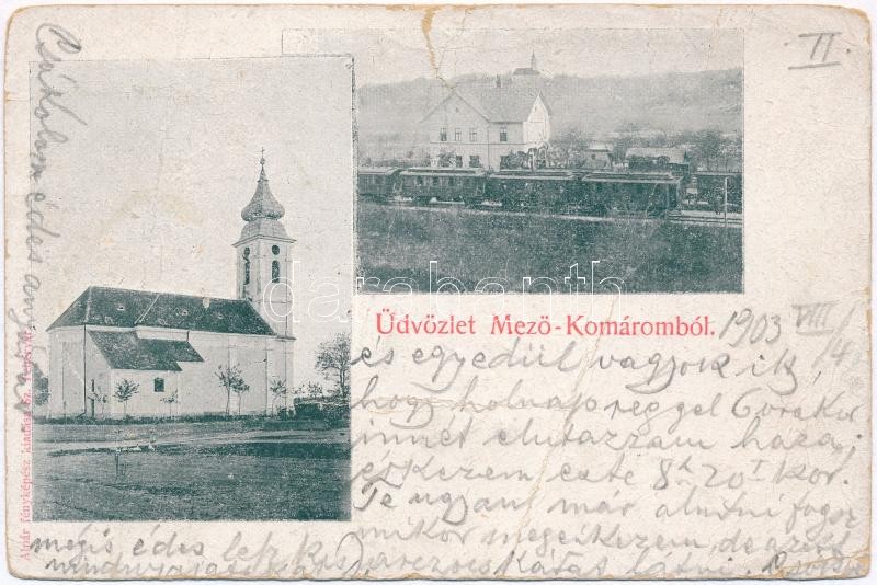 Leírás: 1903 Mezőkomárom, Vasútállomás, vonat, gőzmozdony, templom. Kiadja Alpár fényképész (szakadás / tear)
