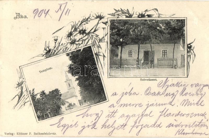 1904 Aka, Római katolikus templom, Szövetkezet üzlete. Kiadja Klökner ... https://www.darabanth.com/hu/342-Gyorsarveres/342.0/Kepeslapok/Magyarorszag~2000004/1904-Aka-Romai-katolikus-templom-Szovetkezet-uzlete-Kiadja-Klokner-P-Art-Nouveau-floral~II1928781