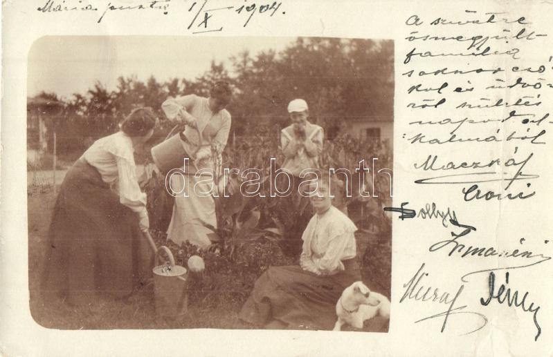 Leírás: 1904 Máriapuszta (Tata, Tata-Tóváros); szüretre összegyűlt família a kertben, növények öntözése, kutya. photo
