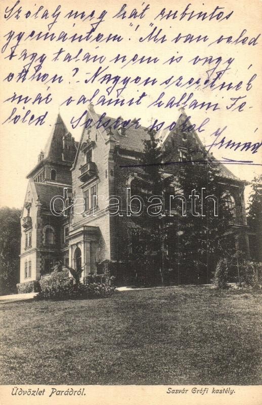 Leírás: 1907 Parádsasvár, Parád; Sasvár grófi kastély. Kiadja a Parádi Fogyasztási Szövetkezet, fényképezte Rónai Eger
