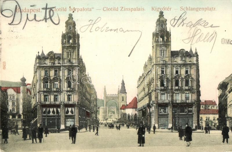1908 Budapest V. Kígyó tér (Ferenciek tere), Klotild paloták, üzletek,... https://www.darabanth.com/hu/342-Gyorsarveres/342.0/Kepeslapok/Magyarorszag~2000004/1908-Budapest-V-Kigyo-ter-Ferenciek-tere-Klotild-palotak-uzletek-Erzsebet-hid-Taussig-~II1930837
